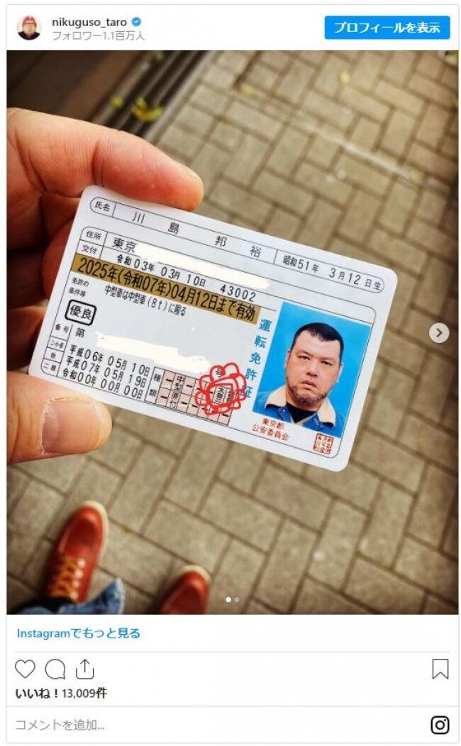 お笑いコンビ野性爆弾のくっきー!が10日、インスタグラムを更新。自身の免許証の写真をアップし、大型自動二輪の免許取得をアピールした。