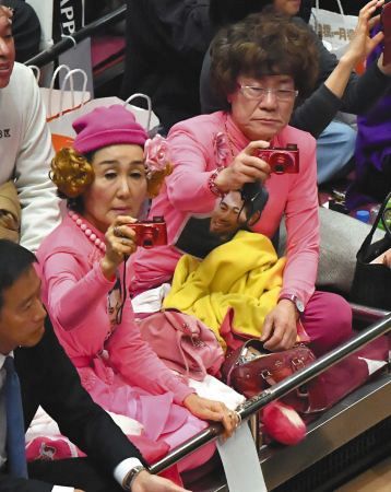 大相撲中継を見ていると、観客席で誰よりも目立っているのが、全身ピンクというおそろいの衣装で観戦しているタレントの林家ペー、パー子夫妻の姿だ。代名詞となっているカメラのシャッターを押しまくりながら、土俵に熱視線を送る好角家。大相撲の魅力を語り、長年撮りためた写真の一部を披露してくれた。(取材・構成=手島 莉子、今関 達巳)