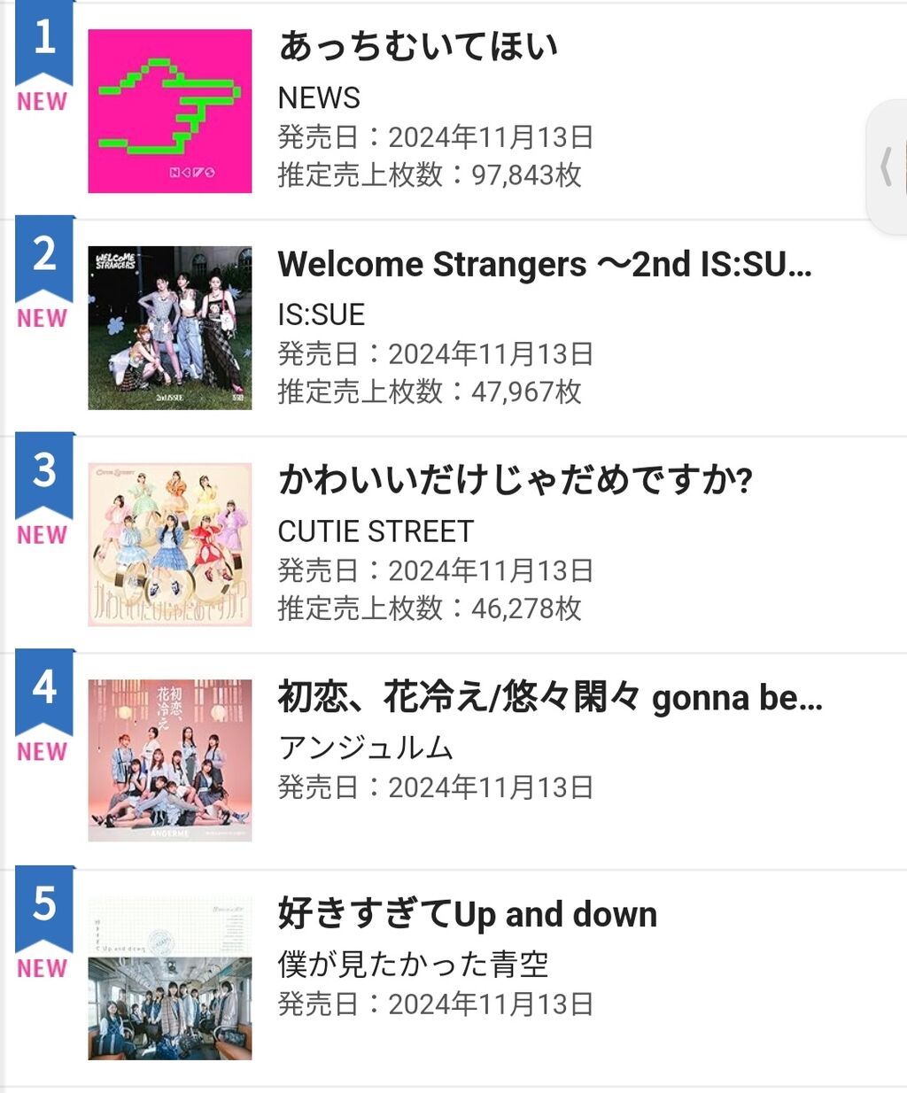 【僕が見たかった青空】4thシングル「好きすぎてUp and down」初日5位、売上枚数不明 スポンサーリンク 2024/11/14 18:47 僕青 【僕が見たかった青空】4thシングル「好きすぎてUp and down」初日5位、売上枚数不明 267: ファンクラブ会員番号774 (ワッチョイ dd7c-N8Qq) 2024/11/13(水) 18:02:35.51 ID:SvjkAz3M0 5位 推定売上不明 続きを読む
