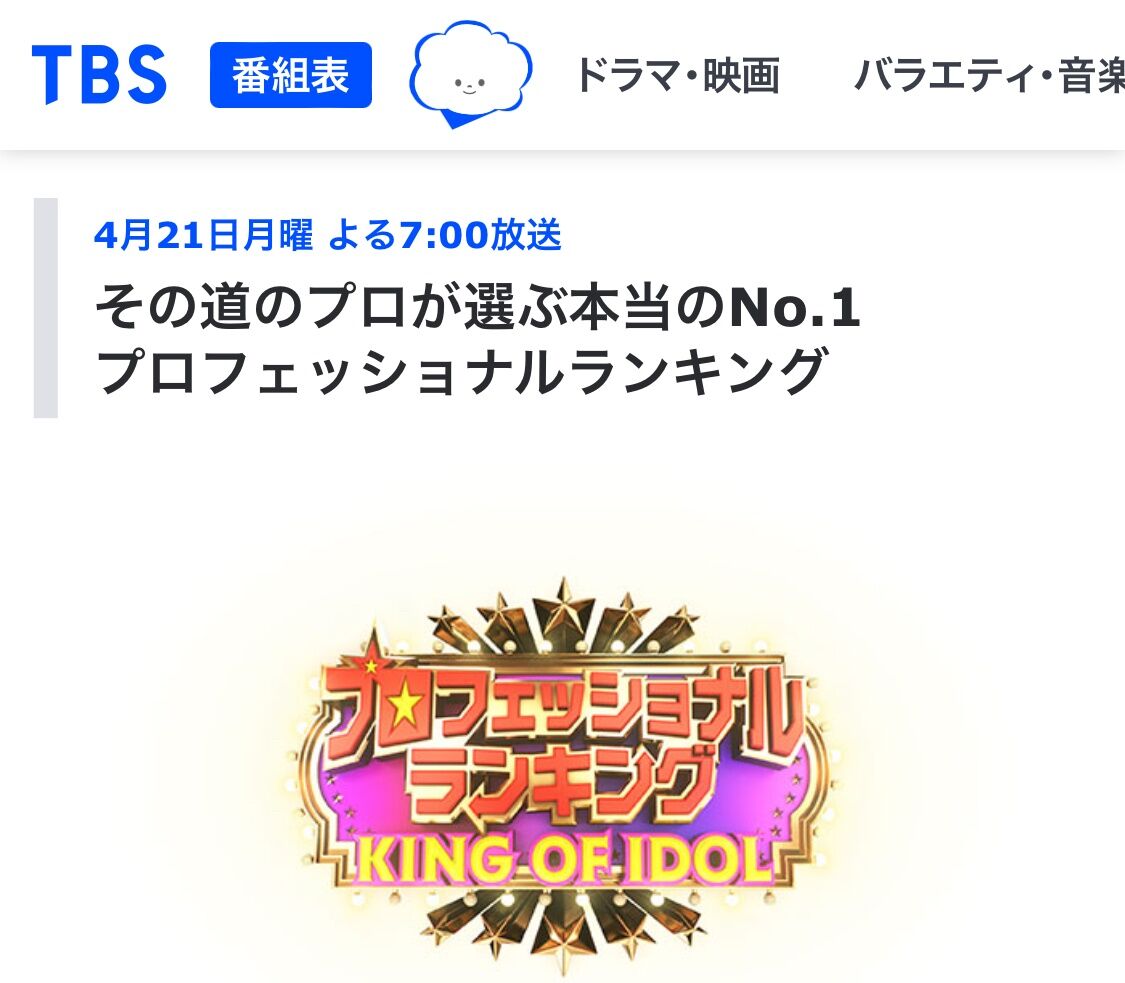 4/21(月)今夜 19時~ TBS『プロフェッショナルランキング』-KING OF IDOL- 女性アイドルソング 1位は?【AKB 乃木坂 モー娘】