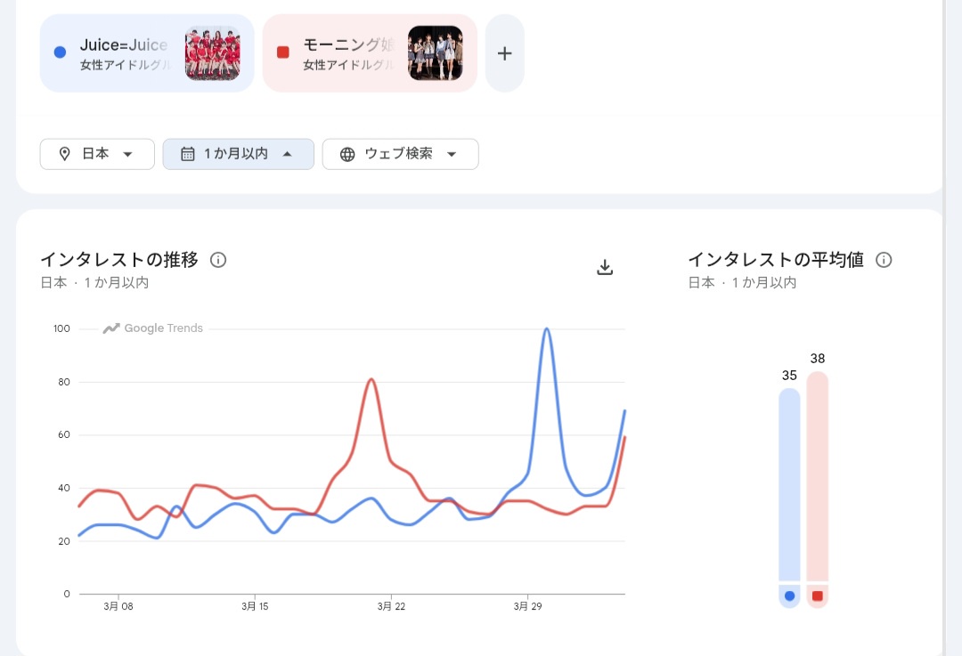 【速報】Juice=Juice、モーニング娘。より話題になってる事実が判明 スポンサーリンク 2026/04/06 02:59 【速報】Juice=Juice、モーニング娘。より話題になってる事実が判明 1: 2026/04/04(土) 13:20:03.04 0 1ヶ月比較 1週間比較 24時間比較 [紹介元] ウルフ速報 【速報】Juice=Juice、モーニング娘。より話題になってる事実が判明
