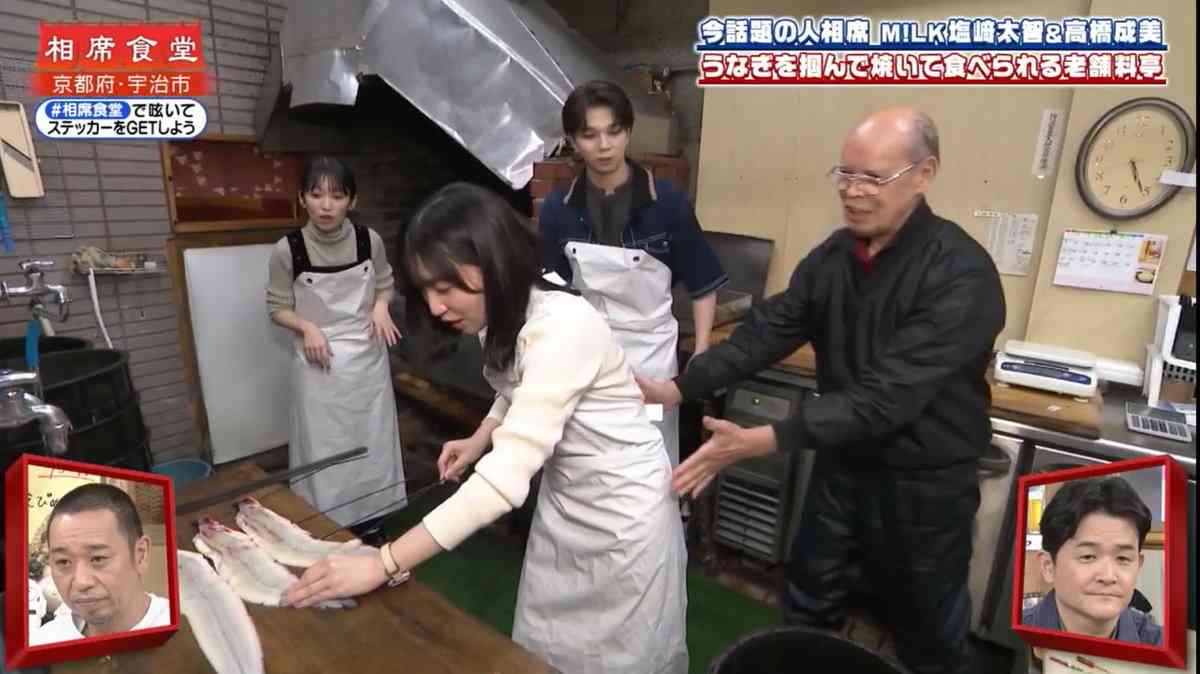 3人はうなぎのくし串打ちを体験することになったが、ここで同店の男性従業員が黒沢、豊田の背後から近づき、2人の腰を両手で軽く触った。黒沢、豊田は反射的に顔を上げて苦笑い。塩﨑も驚いたような表情を見せた。